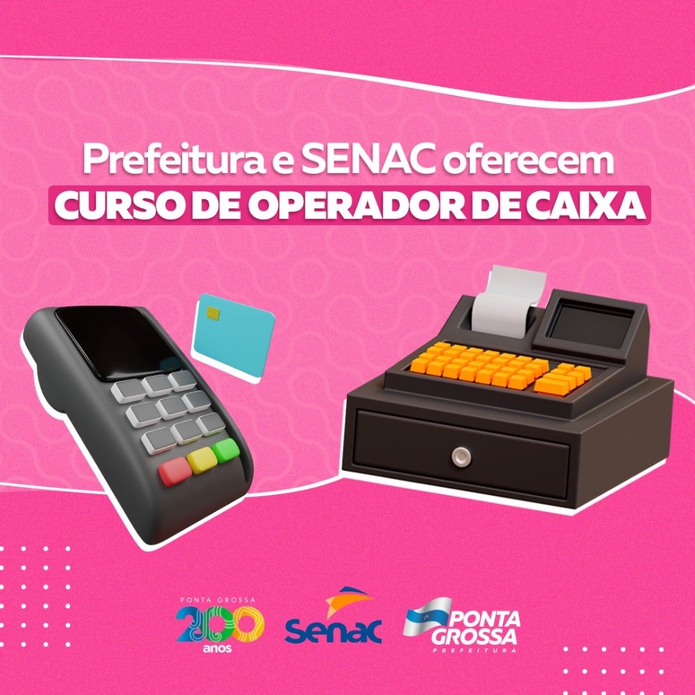 A Prefeitura de Ponta Grossa, através da Secretaria de Indústria, Comércio e Qualificação Profissional, em parceria com o SENAC, informa que estão abertas as inscrições para o curso de Operador de Caixa. O curso, que terá a duração de 160 horas, visa a formação de profissionais para procedimentos de operação de caixa e atendimento ao cliente em empresas de pequeno, médio e grande porte para diversas áreas de varejo, atacado e entretenimento e serviços.
