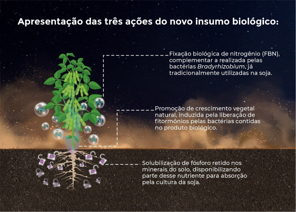 Os outros dois efeitos do bioinsumo também foram comprovados pelas pesquisas, como o aumento do volume de raízes em 31% e de folhas em 29%, devido à liberação de fitohormônios pelos microrganismos, o que estimula o crescimento da planta, de maneira natural, permitindo que a lavoura explore melhor o ambiente disponível e sofra menor pressão de plantas daninhas. Além disso há um complemento na fixação biológica do nitrogênio (FBN) promovido pelo inoculante de Bradyrhizobium, tradicionalmente utilizado na cultura da soja, mas que em determinadas situações não é suficiente para atender toda a demanda de nitrogênio para se atingir altas produtividades.