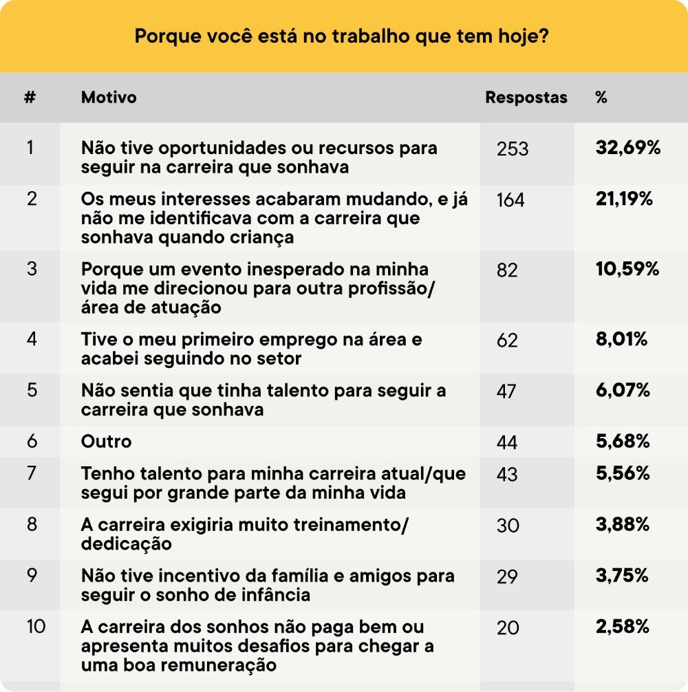 Para aqueles que acabaram em profissões que não as imaginadas quando criança, os principais motivos para se estar no trabalho atual estão relacionados com a falta de oportunidades ou recursos para seguir na carreira com a qual sonhava, indicado por 33% dos entrevistados, e a mudança de interesses ao longo da vida, sendo que, na idade adulta, já não existia mais a identificação com a profissão desejada na infância, apontado por 21%.
