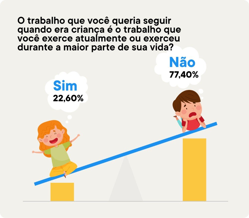 O estudo revelou que 77% dos brasileiros acabaram não seguindo as carreiras que desejavam quando eram crianças, exercendo atualmente ou ao longo da vida trabalhos em outras áreas que não as imaginadas. Desta forma, apenas 23% realmente seguiram com as profissões que sonhavam na infância.