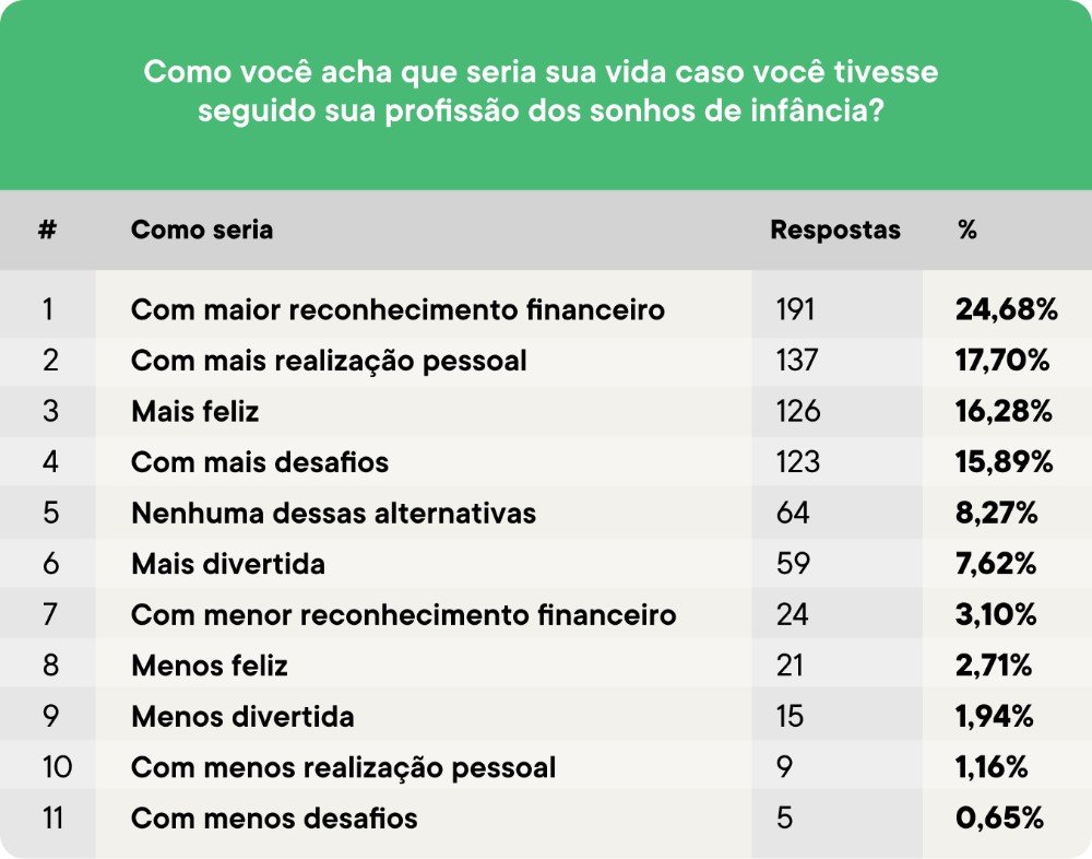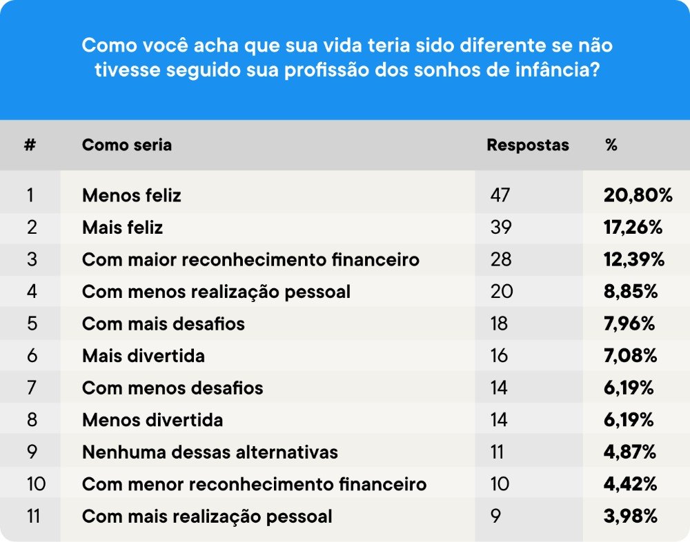 Quando perguntados sobre o que poderia ter sido diferente caso não tivessem seguido a profissão aspirada durante a infância, para 21% dos entrevistados a vida poderia ser menos feliz, enquanto para 17% a vida poderia ter sido mais feliz. 12% acredita que teria maior reconhecimento financeiro.