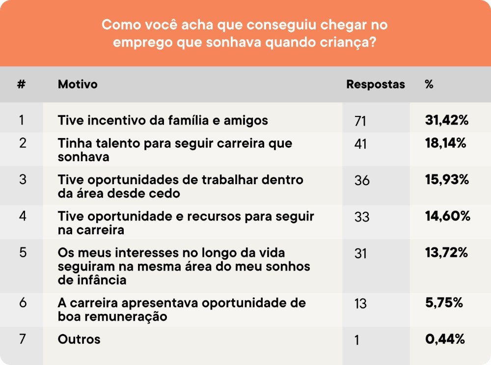 Já para aqueles que seguiram as carreiras dos sonhos de infância, os principais motivos para conseguirem alcançar o objetivo estão associados a fatores como ter o incentivo da família e amigos, de acordo com 31% dos entrevistados; ter talento para seguir a carreira que sonhava, para 18%; ter conseguido trabalhar dentro da área desde cedo, segundo 16%, e ter tido oportunidades e recursos para seguir na carreira, apontado por 15% dos respondentes.