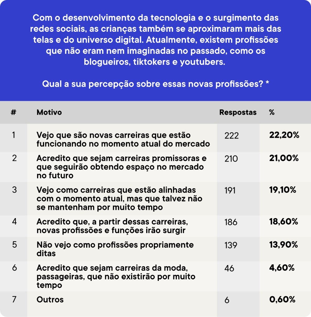 Mesmo assim, essas atividades podem dividir opiniões, por não seguirem os caminhos convencionais de construção de carreiras no mercado. Para entender a opinião dos brasileiros sobre esse novo cenário, a plataforma perguntou a percepção dos entrevistados sobre as novas possibilidades de trabalho relacionadas à internet.