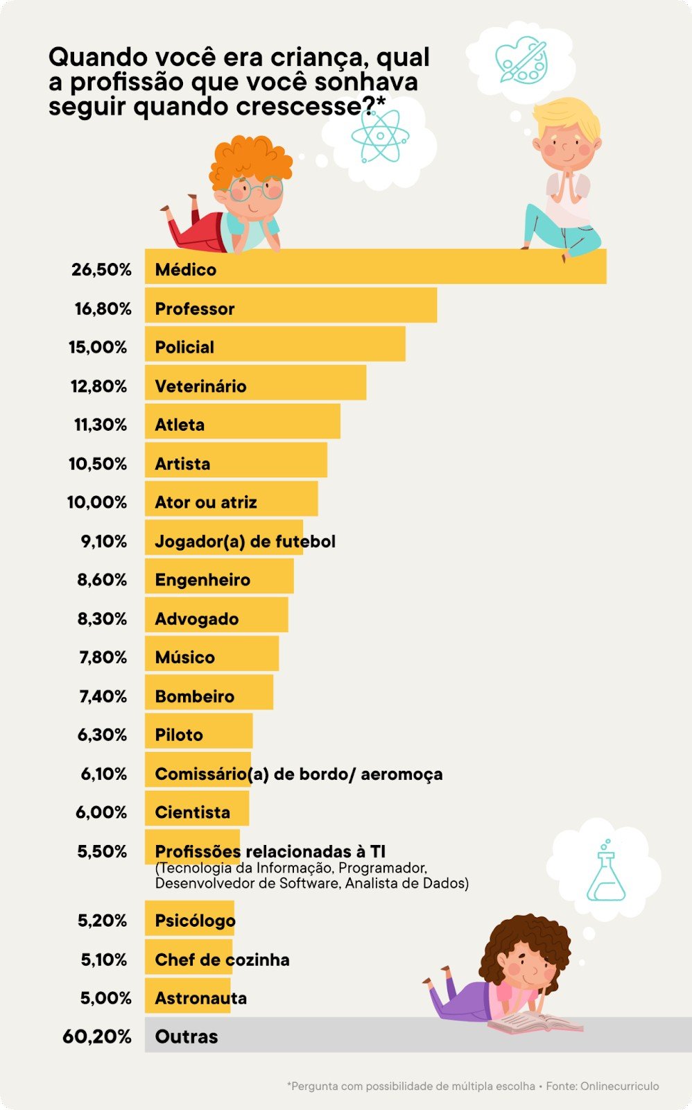 Entre as profissões mais indicadas como aquelas que os entrevistados imaginavam seguir quando eram crianças, estão os trabalhos de médico, indicado por 26% dos respondentes; professor, citado por 17%; policial, apontado por 15%; veterinário, escolhido por 13%; atleta, por 11%; artista, e as carreiras de ator ou atriz, mencionadas por 10%.