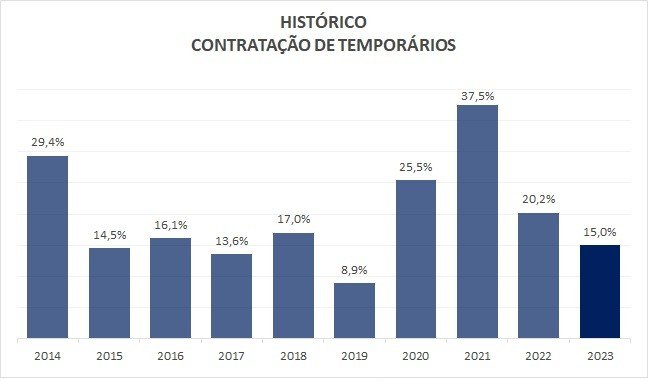 A média de pessoas a serem contratadas temporariamente terá uma redução de 25,7% este ano, passando de 3 a 4 funcionários para 2 a 3 profissionais.