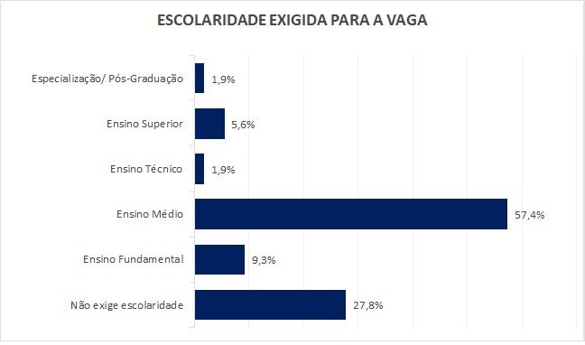 A maioria das vagas (57,4%) vai exigir o Ensino Médio e uma parcela de 27,8% das funções não terá pré-requisitos de escolaridade. As vagas temporárias que demandam o Ensino Fundamental correspondem a 9,3%, as que solicitam Ensino Superior são 5,6%, e as que necessitam de Ensino Técnico somam 1,9%, bem como as que exigem Especialização ou Pós-graduação.