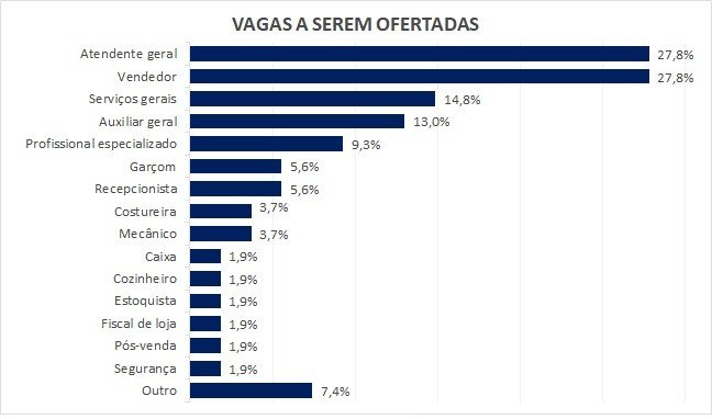 As vagas ofertadas são predominantemente para Atendente em geral e Vendedor, com 27,8% de citações cada. Outras funções como Serviços gerais, Auxiliar geral, Profissional especializado, Garçom e Recepcionista também serão demandadas nesta época.