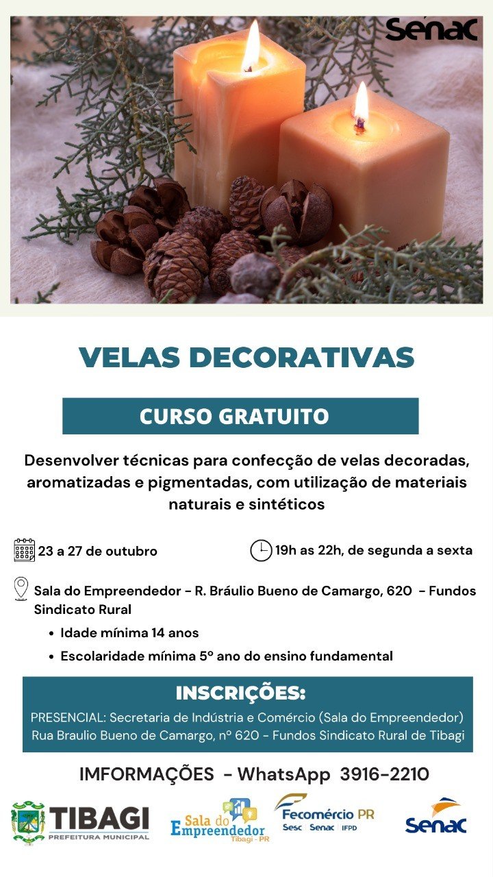 A oferta desta vez é para o curso de Velas Decorativas. Ele é gratuito e será realizado entre os dias 23 a 27 de outubro na Sala do Empreendedor do município das 19h às 22h, de segunda à sexta-feira.