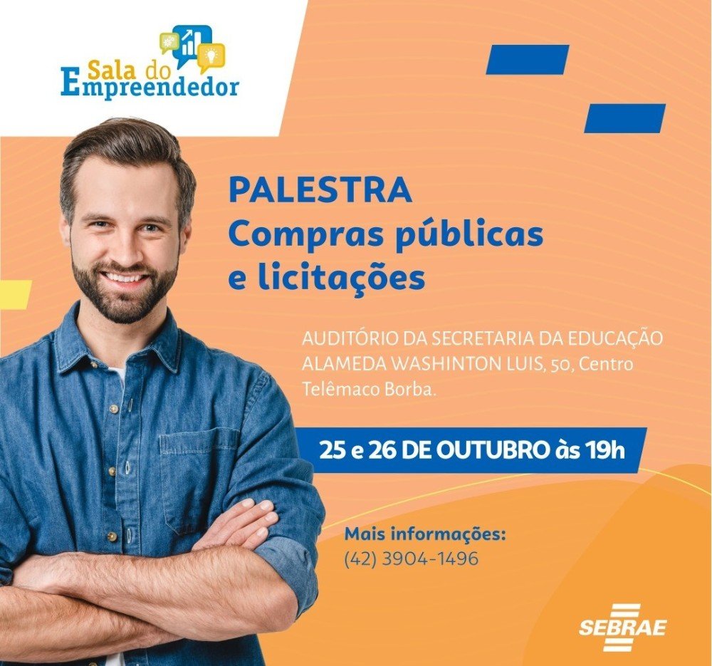 A Prefeitura de Telêmaco Borba, por meio da Secretaria Municipal do Trabalho e Indústria (SMTIC) e a Sala do Empreendedor, promove a palestra Compras públicas e Licitações, nos dias 25 e 26 de outubro (quarta e quinta-feira).
